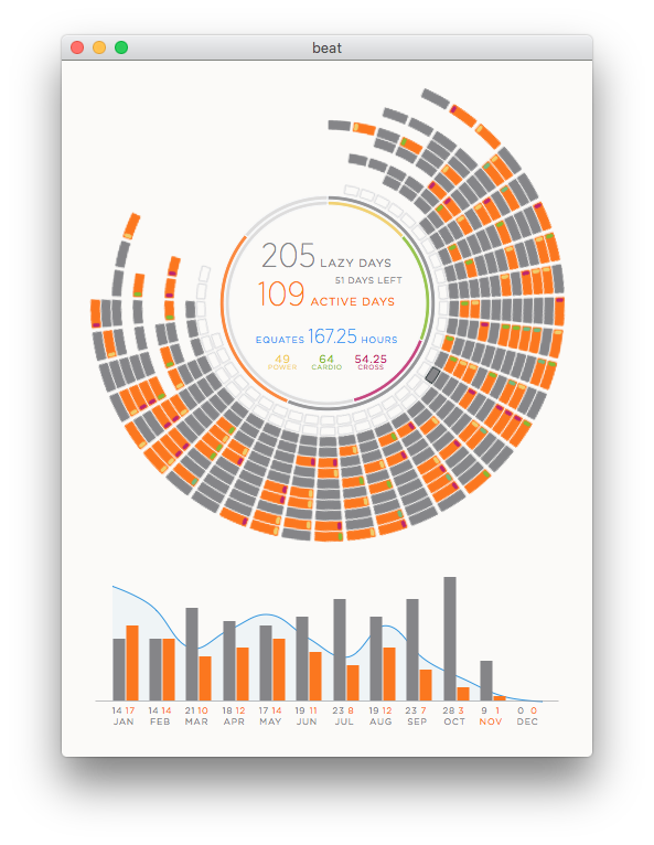 Mein (Sport)jahr 2015 aufgezeichnet mit meiner App beat. Wenn ich schon mal dran bin habe ich gleich mal das neue Jahr vorbereitet und ein paar kleiner Designänderungen und Ergänzungen hinzugefügt. 2016 kann also starten… Als Schmankerl für mich selbst, dass vergangene Jahr als kurzes Video im neuen Design. War ja gar nicht so anstrengend ;-)