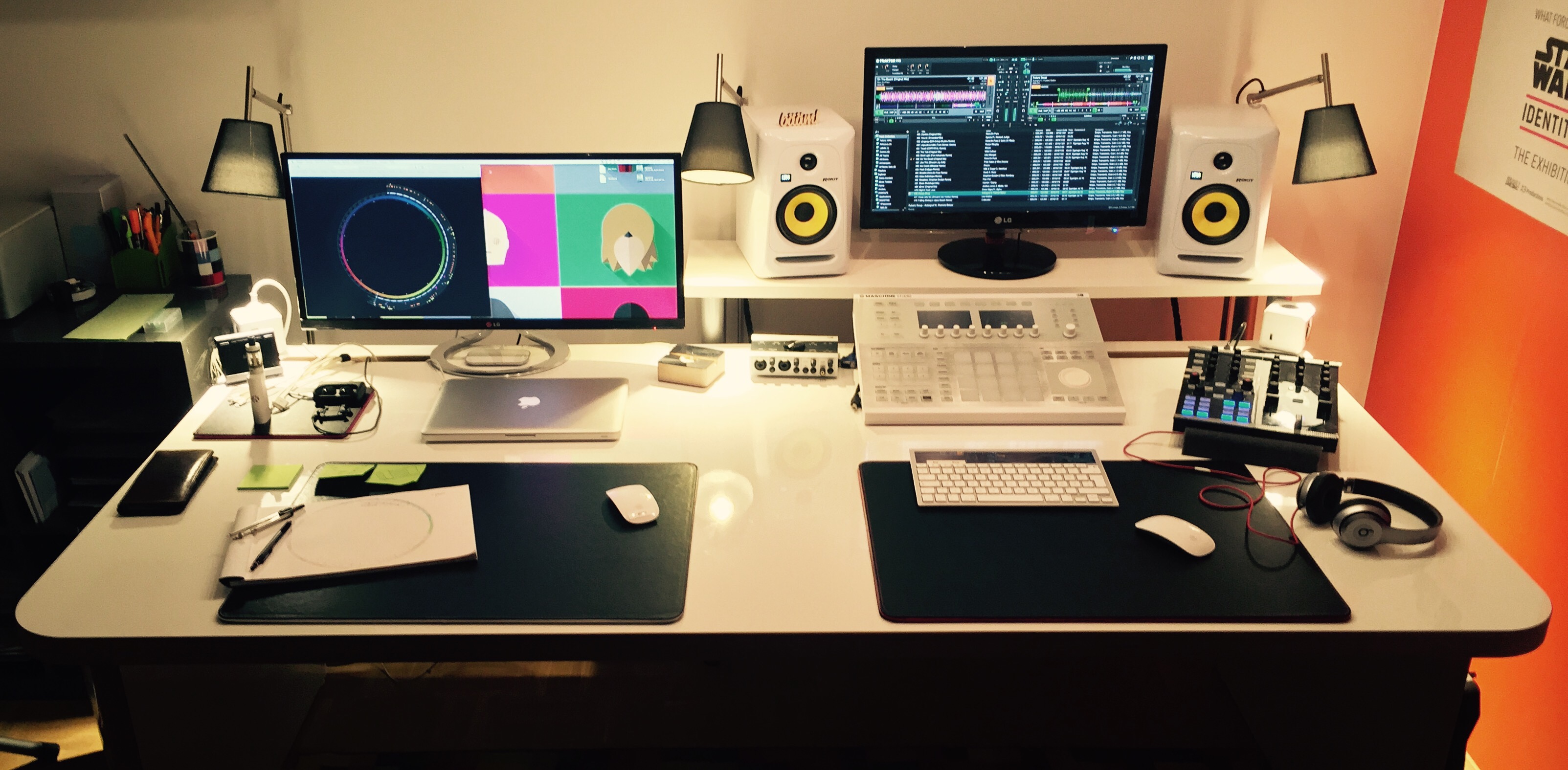 Meine aktueller Desk für entspanntes und kreatives arbeiten. Zur Zeit habe ich eine Trennung zwischen den verschiedenen Betätigungsfeldern. Linke Seite Grafik / Coding, rechte Seite Audio.