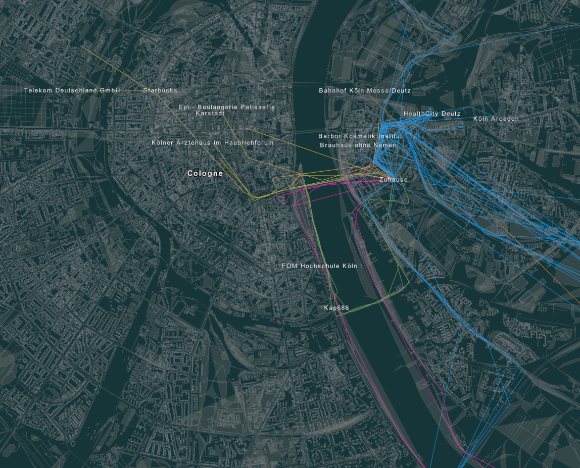 Auto – blau / Strassenbahn – gelb / Rad – rot / Laufen -grün